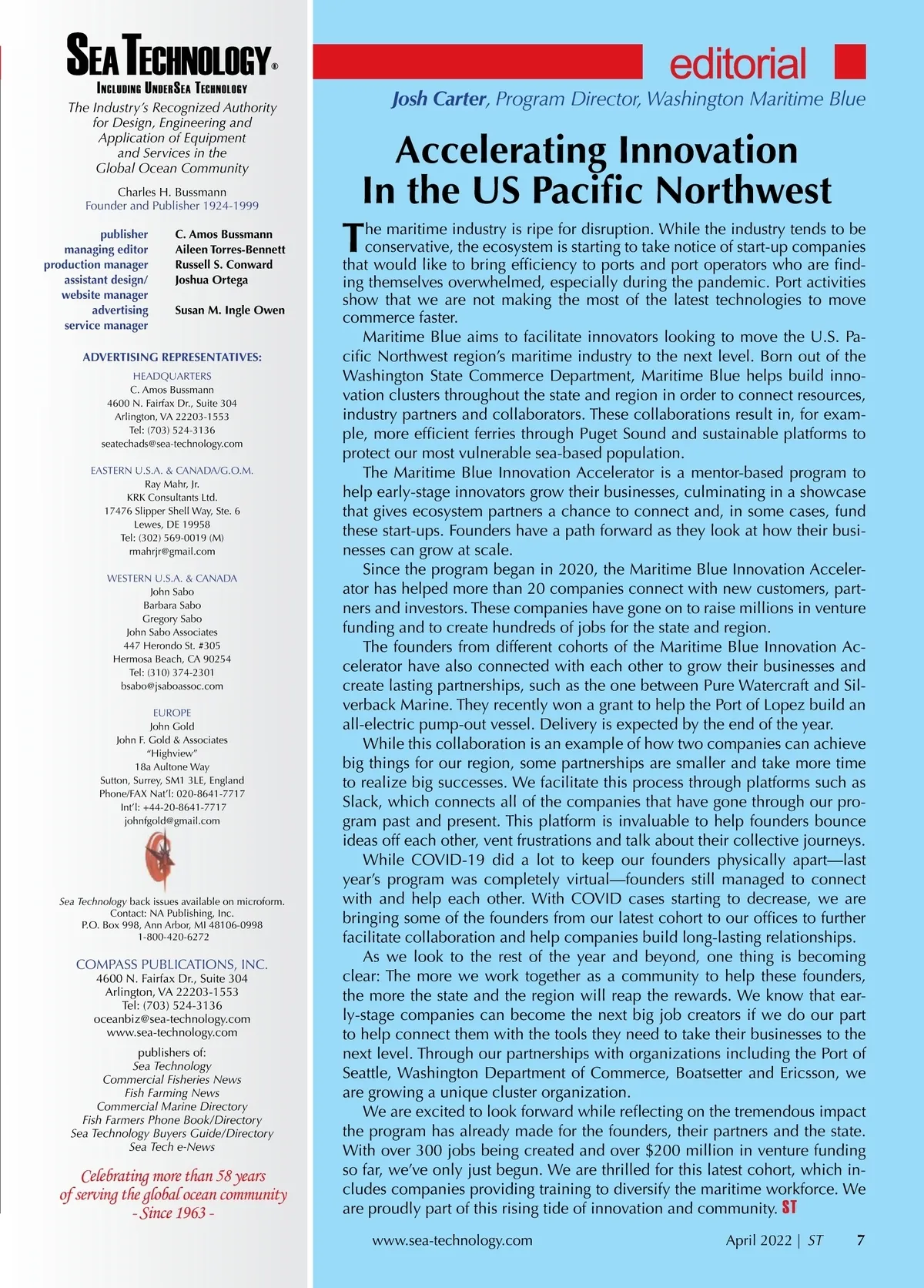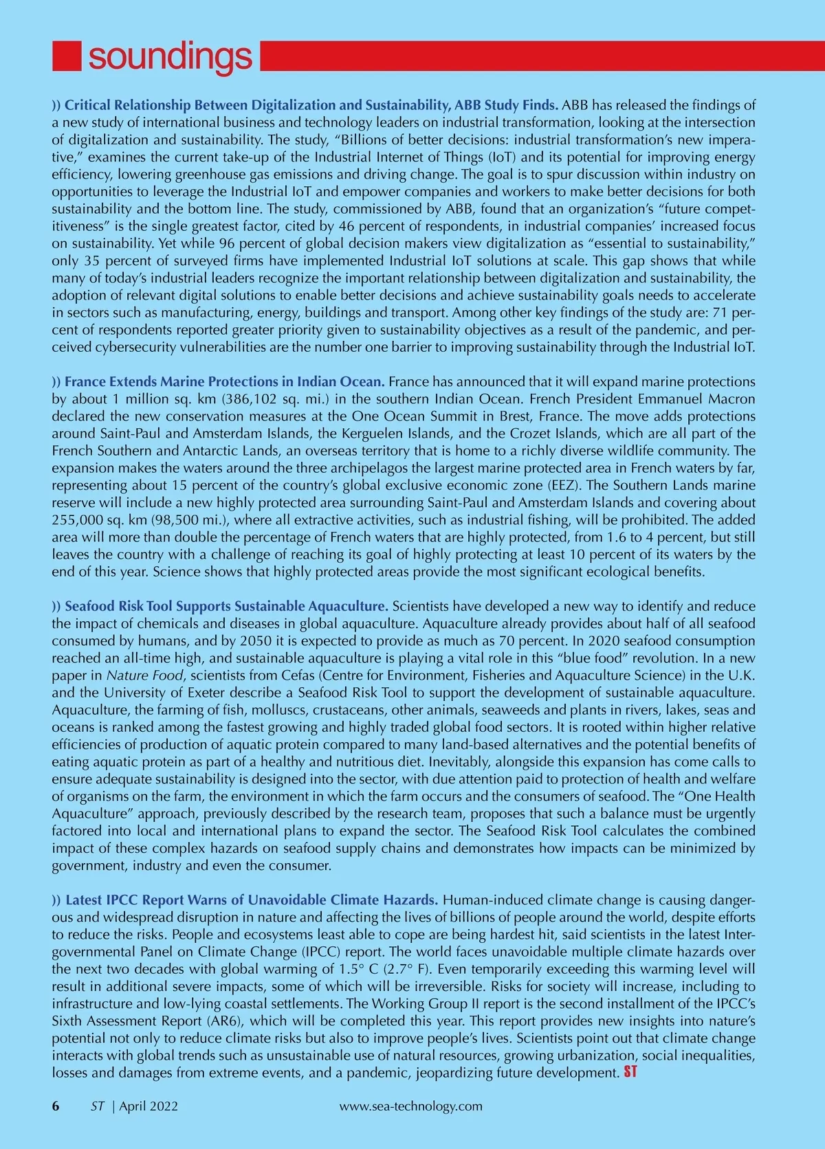soundings )) Critical Relationship Between Digitalization and Sustainability, ABB Study Finds. ABB has released the findings of a new study of international business and technology leaders on industrial transformation, looking at the intersection of digitalization and sustainability. The study, “Billions of better decisions: industrial transformation’s new impera-tive,” examines the current take-up of the Industrial Internet of Things (IoT) and its potential for improving energy efficiency, lowering greenhouse gas emissions and driving change. The goal is to spur discussion within industry on opportunities to leverage the Industrial IoT and empower companies and workers to make better decisions for both sustainability and the bottom line. The study, commissioned by ABB, found that an organization’s “future compet-itiveness” is the single greatest factor, cited by 46 percent of respondents, in industrial companies’ increased focus on sustainability. Yet while 96 percent of global decision makers view digitalization as “essential to sustainability,” only 35 percent of surveyed firms have implemented Industrial IoT solutions at scale. This gap shows that while many of today’s industrial leaders recognize the important relationship between digitalization and sustainability, the adoption of relevant digital solutions to enable better decisions and achieve sustainability goals needs to accelerate in sectors such as manufacturing, energy, buildings and transport. Among other key findings of the study are: 71 per-cent of respondents reported greater priority given to sustainability objectives as a result of the pandemic, and per-ceived cybersecurity vulnerabilities are the number one barrier to improving sustainability through the Industrial IoT. )) France Extends Marine Protections in Indian Ocean. France has announced that it will expand marine protections by about 1 million sq. km (386,102 sq. mi.) in the southern Indian Ocean. French President Emmanuel Macron declared the new conservation measures at the One Ocean Summit in Brest, France. The move adds protections around Saint-Paul and Amsterdam Islands, the Kerguelen Islands, and the Crozet Islands, which are all part of the French Southern and Antarctic Lands, an overseas territory that is home to a richly diverse wildlife community. The expansion makes the waters around the three archipelagos the largest marine protected area in French waters by far, representing about 15 percent of the country’s global exclusive economic zone (EEZ). The Southern Lands marine reserve will include a new highly protected area surrounding Saint-Paul and Amsterdam Islands and covering about 255,000 sq. km (98,500 mi.), where all extractive activities, such as industrial fishing, will be prohibited. The added area will more than double the percentage of French waters that are highly protected, from 1.6 to 4 percent, but still leaves the country with a challenge of reaching its goal of highly protecting at least 10 percent of its waters by the end of this year. Science shows that highly protected areas provide the most significant ecological benefits. )) Seafood Risk Tool Supports Sustainable Aquaculture. Scientists have developed a new way to identify and reduce the impact of chemicals and diseases in global aquaculture. Aquaculture already provides about half of all seafood consumed by humans, and by 2050 it is expected to provide as much as 70 percent. In 2020 seafood consumption reached an all-time high, and sustainable aquaculture is playing a vital role in this “blue food” revolution. In a new paper in Nature Food , scientists from Cefas (Centre for Environment, Fisheries and Aquaculture Science) in the U.K. and the University of Exeter describe a Seafood Risk Tool to support the development of sustainable aquaculture. Aquaculture, the farming of fish, molluscs, crustaceans, other animals, seaweeds and plants in rivers, lakes, seas and oceans is ranked among the fastest growing and highly traded global food sectors. It is rooted within higher relative efficiencies of production of aquatic protein compared to many land-based alternatives and the potential benefits of eating aquatic protein as part of a healthy and nutritious diet. Inevitably, alongside this expansion has come calls to ensure adequate sustainability is designed into the sector, with due attention paid to protection of health and welfare of organisms on the farm, the environment in which the farm occurs and the consumers of seafood. The “One Health Aquaculture” approach, previously described by the research team, proposes that such a balance must be urgently factored into local and international plans to expand the sector. The Seafood Risk Tool calculates the combined impact of these complex hazards on seafood supply chains and demonstrates how impacts can be minimized by government, industry and even the consumer. )) Latest IPCC Report Warns of Unavoidable Climate Hazards. Human-induced climate change is causing danger-ous and widespread disruption in nature and affecting the lives of billions of people around the world, despite efforts to reduce the risks. People and ecosystems least able to cope are being hardest hit, said scientists in the latest Inter-governmental Panel on Climate Change (IPCC) report. The world faces unavoidable multiple climate hazards over the next two decades with global warming of 1.5° C (2.7° F). Even temporarily exceeding this warming level will result in additional severe impacts, some of which will be irreversible. Risks for society will increase, including to infrastructure and low-lying coastal settlements. The Working Group II report is the second installment of the IPCC’s Sixth Assessment Report (AR6), which will be completed this year. This report provides new insights into nature’s potential not only to reduce climate risks but also to improve people’s lives. Scientists point out that climate change interacts with glo