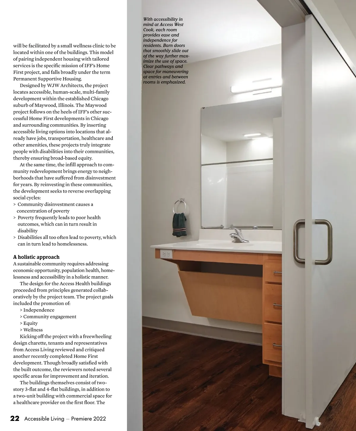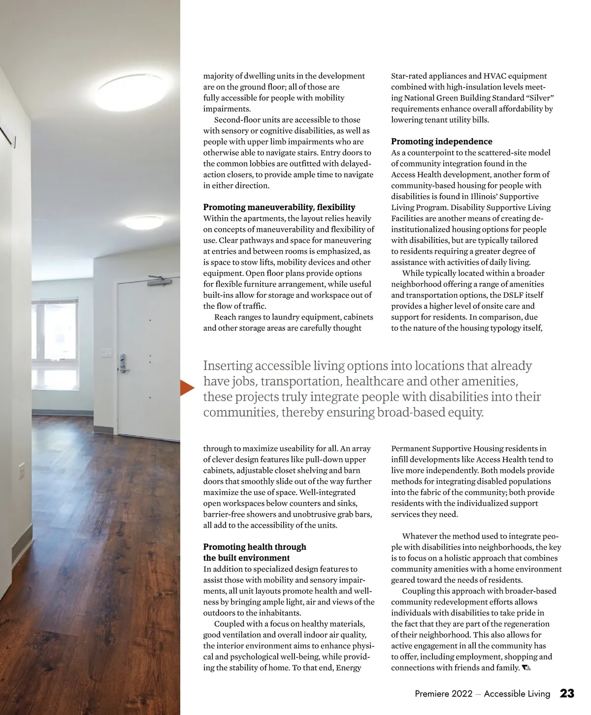 majority of dwelling units in the development are on the ground floor; all of those are fully accessible for people with mobility impairments. Second-floor units are accessible to those with sensory or cognitive disabilities, as well as people with upper limb impairments who are otherwise able to navigate stairs. Entry doors to the common lobbies are outfitted with delayed-action closers, to provide ample time to navigate in either direction. Star-rated appliances and HVAC equipment combined with high-insulation levels meet-ing National Green Building Standard “Silver” requirements enhance overall affordability by lowering tenant utility bills. Promoting independence As a counterpoint to the scattered-site model of community integration found in the Access Health development, another form of community-based housing for people with disabilities is found in Illinois’ Supportive Living Program. Disability Supportive Living Facilities are another means of creating de-institutionalized housing options for people with disabilities, but are typically tailored to residents requiring a greater degree of assistance with activities of daily living. While typically located within a broader neighborhood offering a range of amenities and transportation options, the DSLF itself provides a higher level of onsite care and support for residents. In comparison, due to the nature of the housing typology itself, Promoting maneuverability, flexibility Within the apartments, the layout relies heavily on concepts of maneuverability and flexibility of use. Clear pathways and space for maneuvering at entries and between rooms is emphasized, as is space to stow lifts, mobility devices and other equipment. Open floor plans provide options for flexible furniture arrangement, while useful built-ins allow for storage and workspace out of the flow of traffic. Reach ranges to laundry equipment, cabinets and other storage areas are carefully thought Inserting accessible living options into locations that already have jobs, transportation, healthcare and other amenities, these projects truly integrate people with disabilities into their communities, thereby ensuring broad-based equity. through to maximize useability for all. An array of clever design features like pull-down upper cabinets, adjustable closet shelving and barn doors that smoothly slide out of the way further maximize the use of space. Well-integrated open workspaces below counters and sinks, barrier-free showers and unobtrusive grab bars, all add to the accessibility of the units. Permanent Supportive Housing residents in infill developments like Access Health tend to live more independently. Both models provide methods for integrating disabled populations into the fabric of the community; both provide residents with the individualized support services they need. Whatever the method used to integrate peo-ple with disabilities into neighborhoods, the key is to focus on a holistic approach that combines community amenities with a home environment geared toward the needs of residents. Coupling this approach with broader-based community redevelopment efforts allows individuals with disabilities to take pride in the fact that they are part of the regeneration of their neighborhood. This also allows for active engagement in all the community has to offer, including employment, shopping and connections with friends and family. Promoting health through the built environment In addition to specialized design features to assist those with mobility and sensory impair-ments, all unit layouts promote health and well-ness by bringing ample light, air and views of the outdoors to the inhabitants. Coupled with a focus on healthy materials, good ventilation and overall indoor air quality, the interior environment aims to enhance physi-cal and psychological well-being, while provid-ing the stability of home. To that end, Energy Premiere 2022 – Accessible Living 23