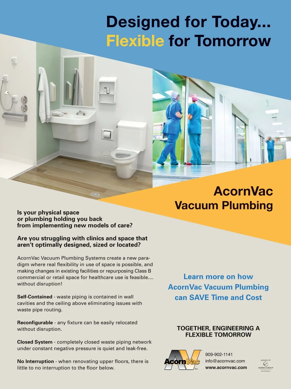 Designed for Today... Flexible for Tomorrow Is your physical space or plumbing holding you back from implementing new models of care? Are you struggling with clinics and space that aren’t optimally designed, sized or located? AcornVac Vacuum Plumbing Systems create a new para-digm where real flexibility in use of space is possible, and making changes in existing facilities or repurposing Class B commercial or retail space for healthcare use is feasible.... without disruption! Self-Contained -waste piping is contained in wall cavities and the ceiling above eliminating issues with waste pipe routing. Reconfigurable -any fixture can be easily relocated without disruption. Closed System -completely closed waste piping network under constant negative pressure is quiet and leak-free. No Interruption -when renovating upper floors, there is little to no interruption to the floor below. Vacuum Plumbing AcornVac Learn more on how AcornVac Vacuum Plumbing can SAVE Time and Cost TOGETHER, ENGINEERING A FLEXIBLE TOMORROW 909-902-1141 info@acornvac.com www.acornvac.com