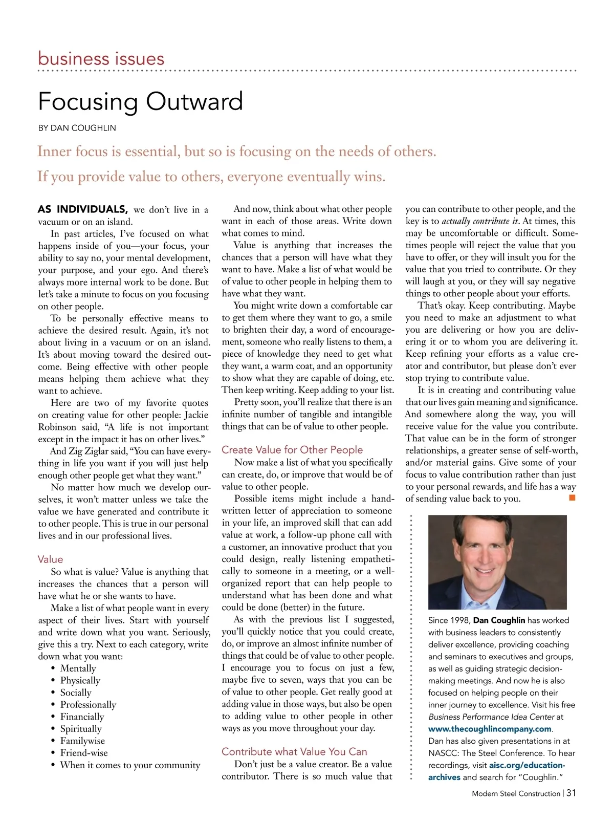 business issues Focusing Outward BY DAN COUGHLIN Inner focus is essential, but so is focusing on the needs of others. If you provide value to others, everyone eventually wins. AS INDIVIDUALS, we don’t live in a vacuum or on an island. In past articles, I’ve focused on what happens inside of you—your focus, your ability to say no, your mental development, your purpose, and your ego. And there’s always more internal work to be done. But let’s take a minute to focus on you focusing on other people. To be personally effective means to achieve the desired result. Again, it’s not about living in a vacuum or on an island. It’s about moving toward the desired out-come. Being effective with other people means helping them achieve what they want to achieve. Here are two of my favorite quotes on creating value for other people: Jackie Robinson said, “A life is not important except in the impact it has on other lives.” And Zig Ziglar said, “You can have every-thing in life you want if you will just help enough other people get what they want.” No matter how much we develop our-selves, it won’t matter unless we take the value we have generated and contribute it to other people. This is true in our personal lives and in our professional lives. And now, think about what other people want in each of those areas. Write down what comes to mind. Value is anything that increases the chances that a person will have what they want to have. Make a list of what would be of value to other people in helping them to have what they want. You might write down a comfortable car to get them where they want to go, a smile to brighten their day, a word of encourage-ment, someone who really listens to them, a piece of knowledge they need to get what they want, a warm coat, and an opportunity to show what they are capable of doing, etc. Then keep writing. Keep adding to your list. Pretty soon, you’ll realize that there is an in nite number of tangible and intangible things that can be of value to other people. you can contribute to other people, and the key is to actually contribute it . At times, this may be uncomfortable or dif cult. Some-times people will reject the value that you have to offer, or they will insult you for the value that you tried to contribute. Or they will laugh at you, or they will say negative things to other people about your efforts. That’s okay. Keep contributing. Maybe you need to make an adjustment to what you are delivering or how you are deliv-ering it or to whom you are delivering it. Keep re ning your efforts as a value cre-ator and contributor, but please don’t ever stop trying to contribute value. It is in creating and contributing value that our lives gain meaning and signi cance. And somewhere along the way, you will receive value for the value you contribute. That value can be in the form of stronger relationships, a greater sense of self-worth, and/or material gains. Give some of your focus to value contribution rather than just to your personal rewards, and life has a way ■ of sending value back to you. Create Value for Other People Value So what is value? Value is anything that increases the chances that a person will have what he or she wants to have. Make a list of what people want in every aspect of their lives. Start with yourself and write down what you want. Seriously, give this a try. Next to each category, write down what you want: • Mentally • Physically • Socially • Professionally • Financially • Spiritually • Familywise • Friend-wise • When it comes to your community Now make a list of what you speci cally can create, do, or improve that would be of value to other people. Possible items might include a hand-written letter of appreciation to someone in your life, an improved skill that can add value at work, a follow-up phone call with a customer, an innovative product that you could design, really listening empatheti-cally to someone in a meeting, or a well-organized report that can help people to understand what has been done and what could be done (better) in the future. As with the previous list I suggested, you’ll quickly notice that you could create, do, or improve an almost in nite number of things that could be of value to other people. I encourage you to focus on just a few, maybe ve to seven, ways that you can be of value to other people. Get really good at adding value in those ways, but also be open to adding value to other people in other ways as you move throughout your day. Contribute what Value You Can Don’t just be a value creator. Be a value contributor. There is so much value that Since 1998, Dan Coughlin has worked with business leaders to consistently deliver excellence, providing coaching and seminars to executives and groups, as well as guiding strategic decision-making meetings. And now he is also focused on helping people on their inner journey to excellence. Visit his free Business Performance Idea Center at www.thecoughlincompany.com . Dan has also given presentations in at NASCC: The Steel Conference. To hear recordings, visit aisc.org/education-archives and search for “Coughlin.” Modern Steel Construction | 31